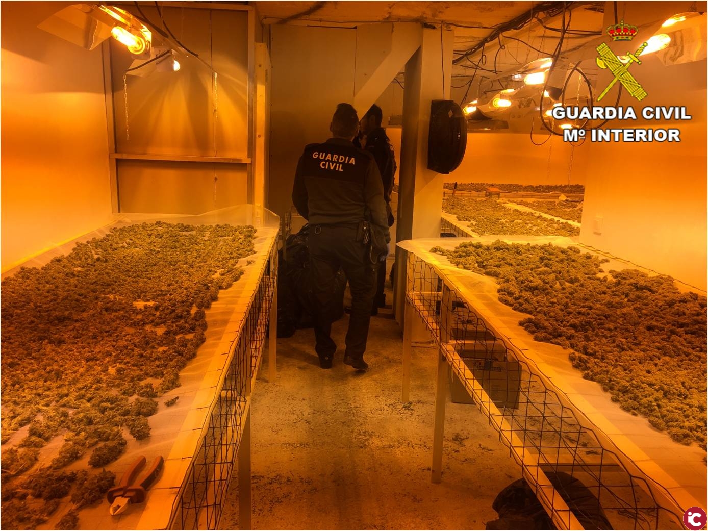 Al realizar el registro, los agentes descubrieron un sótano en el que había instalado un sistema de plantación hidropónica indoor, que ahora estaba en fase de secado de los cogollos.