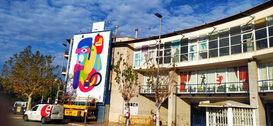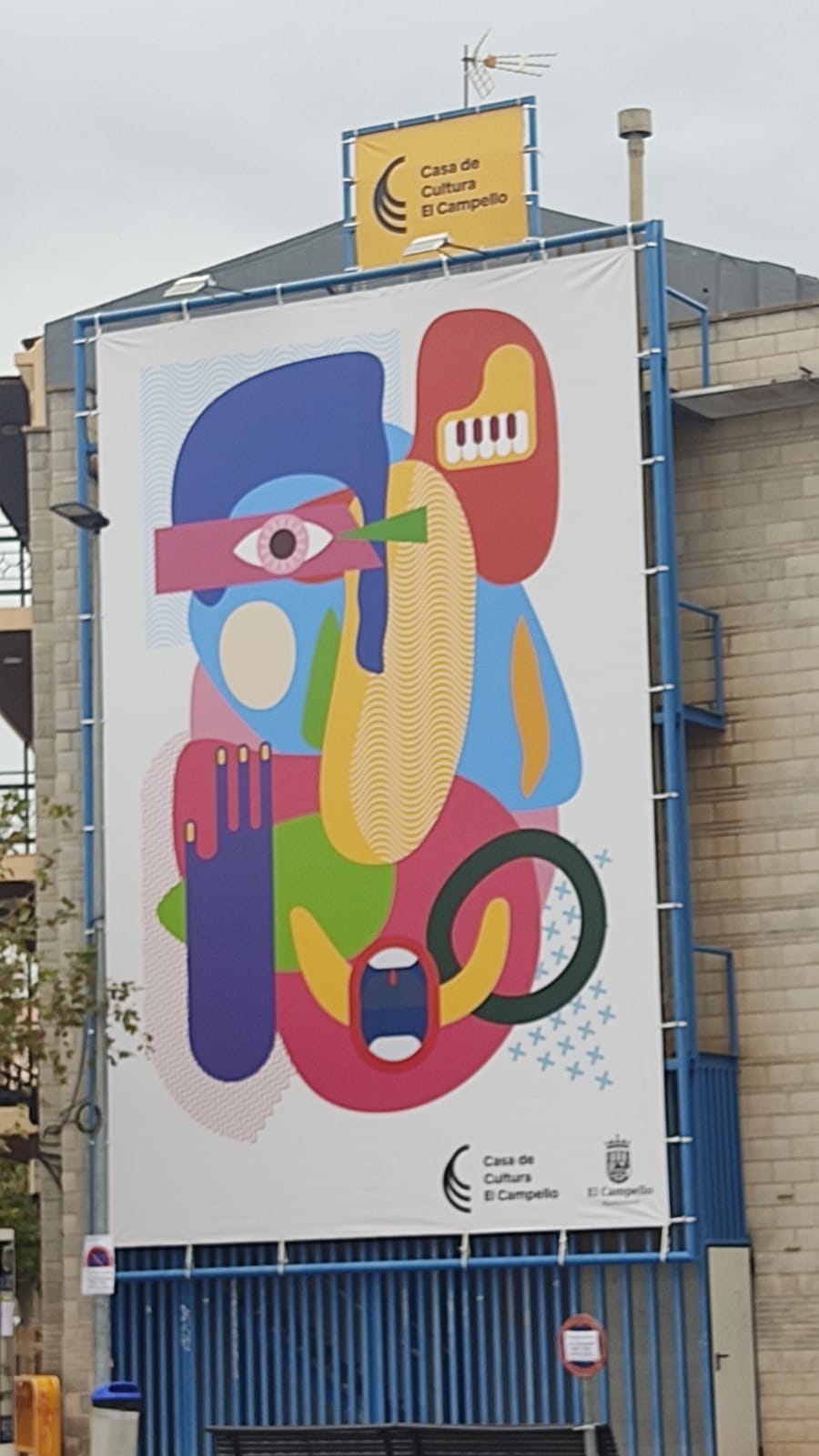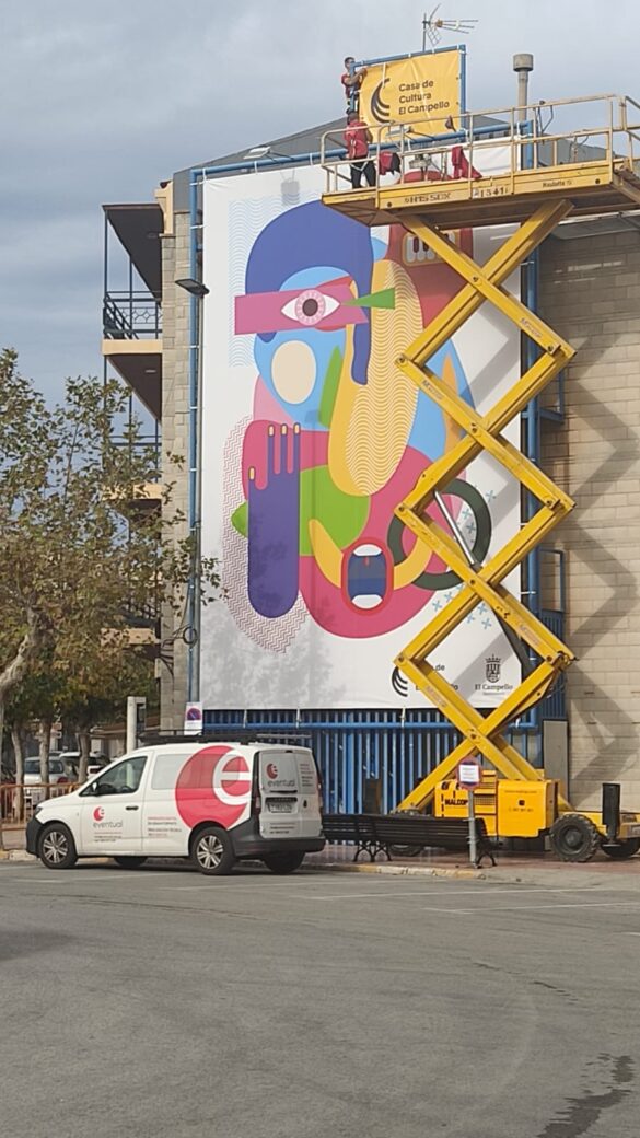 La gran lona exterior de fachada de la Casa de Cultura de El Campello, obra del alicantino Javier García Fernández, ya luce en todo su esplendor en un espacio que ha permanecido vacío desde que la anterior obra se deterioró en exceso y tuvo que ser retirada.