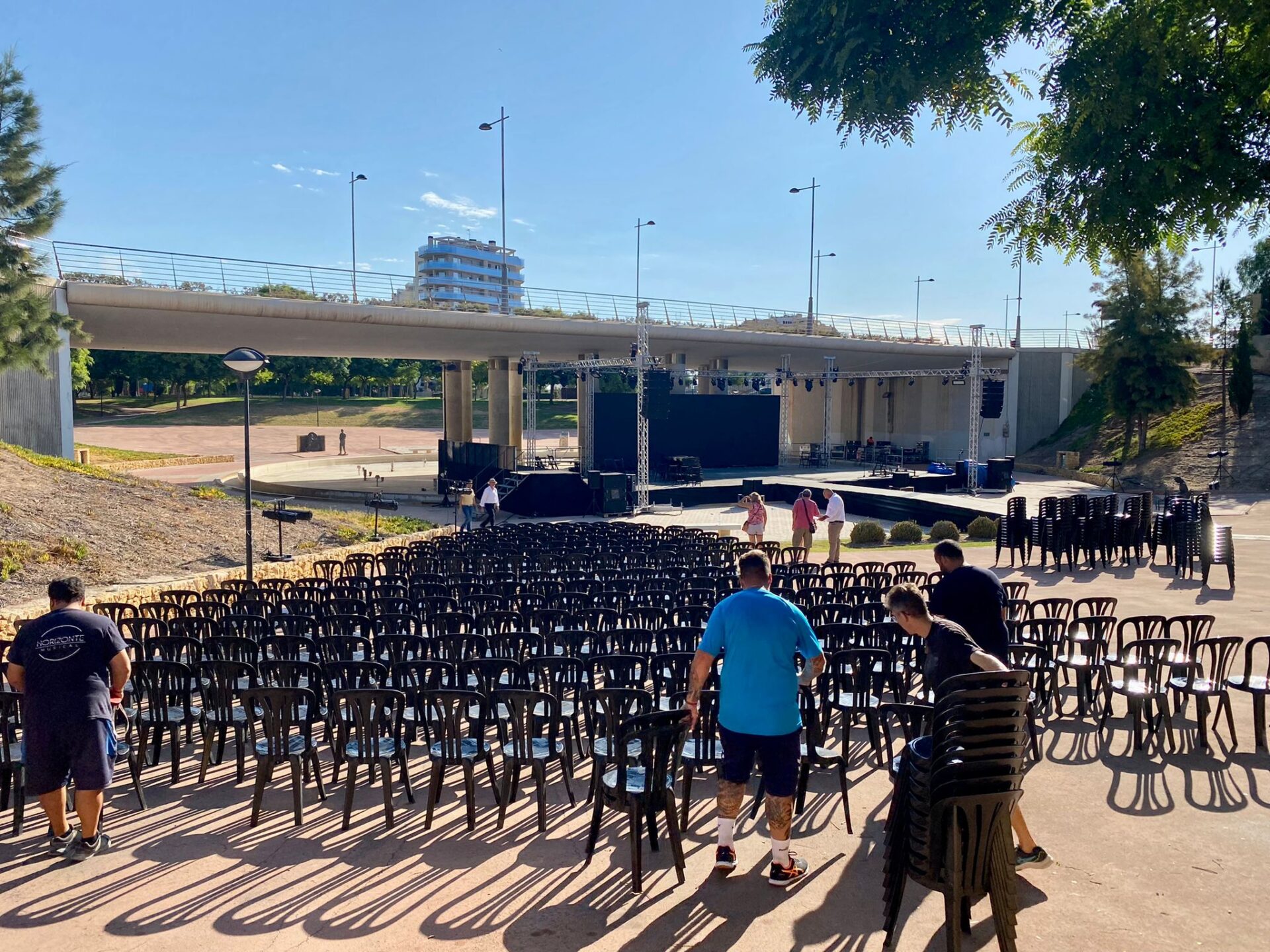 En el parque todo está dispuesto. Equipos técnicos, operarios de Obras y Servicios y personal de limpieza ya han ultimado la preparación del espacio. El espectáculo se desarrollara en los accesos y sobre un escenario de 200 metros cuadrados, mientras el público se acomodará sobre las 1.200 sillas colocadas en la explanada central y laterales del recinto. El alcalde Juanjo Berenguer y el concejal de Fiestas y Tradiciones, Cristian Palomares (PP), han supervisado esta mañana el montaje, acompañados por representantes de la Junta Festera.