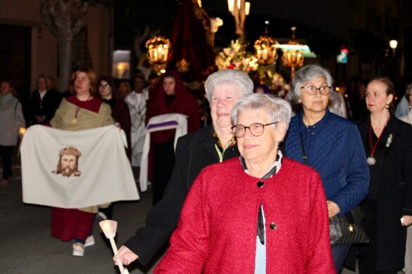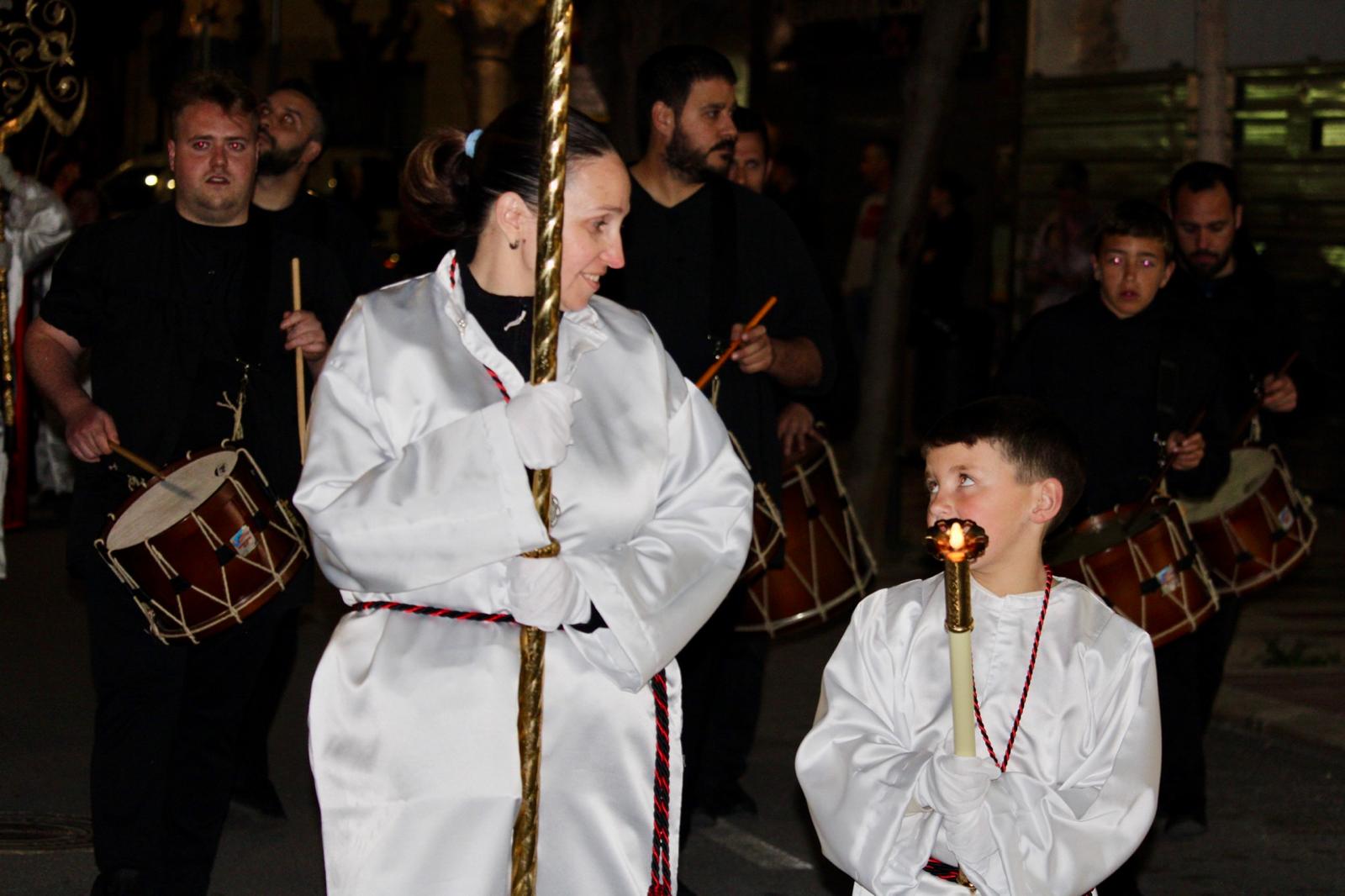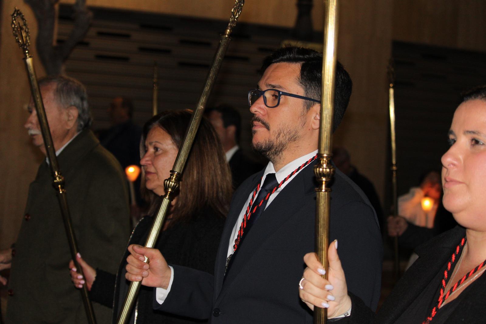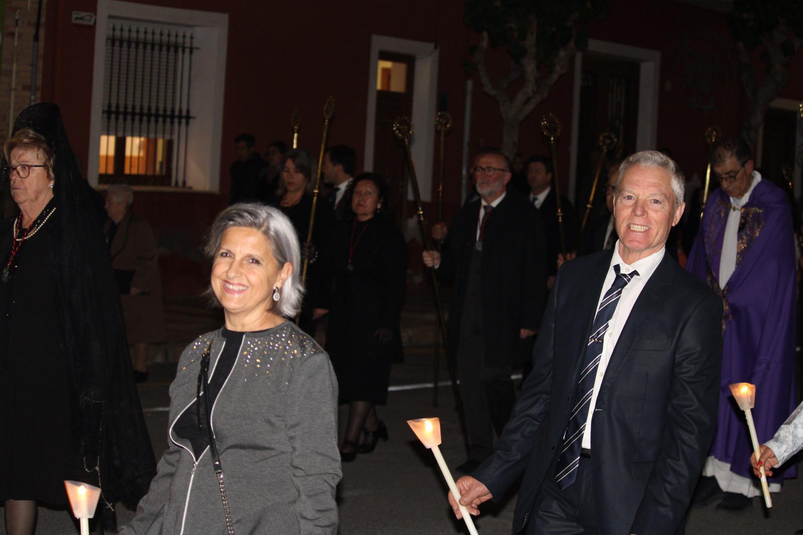 La comitiva fue amplia. A partir de las 22:00 horas, la Cruz Parroquial portada por monaguillos daba paso a tambores, emblemas, estandartes, nazarenos, damas de mantilla, la imagen de La Verónica, la Cruz con el Santo Sudario, lienzos de la Santa Faz, el paso principal, las autoridades religiosas y la representación de la autoridad civil, integrada por varios concejales y concejalas encabezados pro el alcalde, Juanjo Berenguer.
