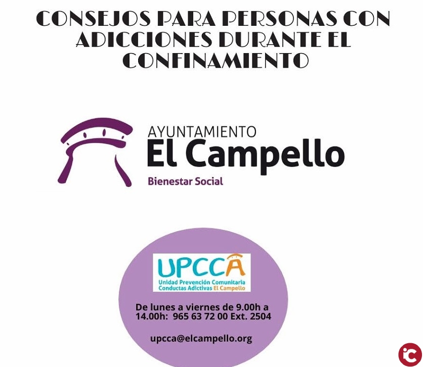 La concejalía de Bienestar Social, a través de la UPCCA (Unidad de Prevención Comunitaria de Conductas Adictivas) ha elaborado un listado de consejos a tener presente durante el confinamiento, para personas adictas a diferentes drogas. Este breve manual nace desde la consciencia de que existe una alta prevalencia de enfermedades crónicas relevantes entre los consumidores de sustancias estupefacientes, lo que conllevaría un riesgo particular de enfermedad respiratoria grave si se infectaran con el COVID-19.