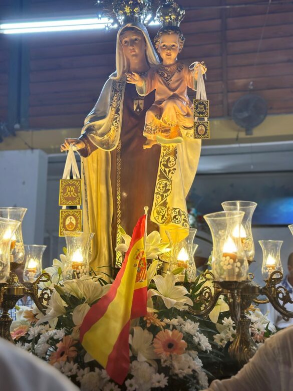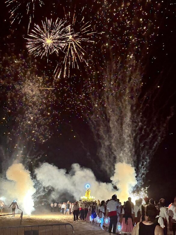La peculiaridad de este acto radica en que el traslado se realiza atravesando la playa, sobre la arena, lo que ofrece una imagen atractiva por el paso de un trono iluminado y decenas de farolillos que portaban los participantes, entre los que se encontraban el alcalde, Juanjo Berenguer; la concejala de Fiestas y Tradiciones, Marisa Navarro, y ediles de diversos partidos políticos con representación municipal.