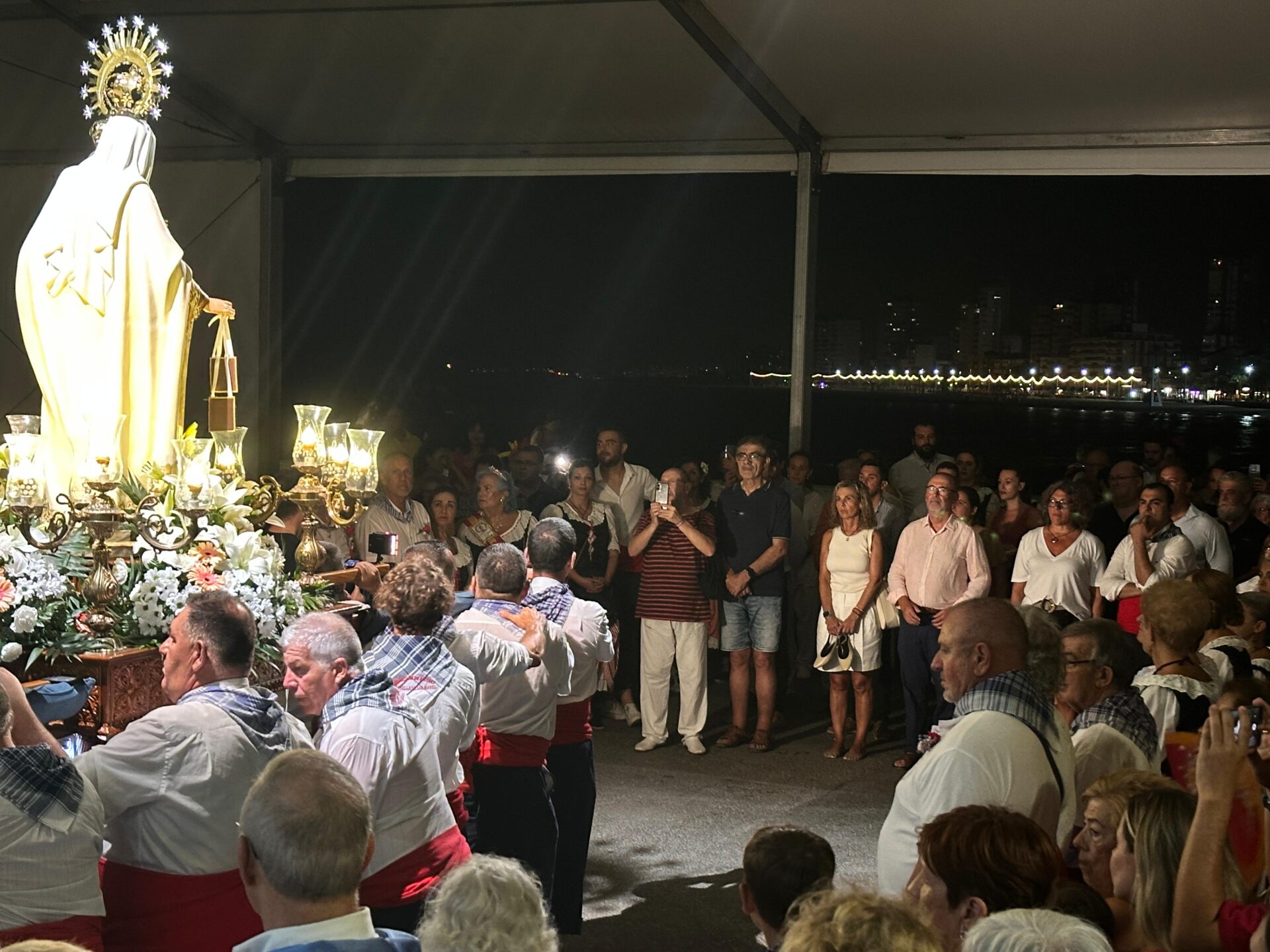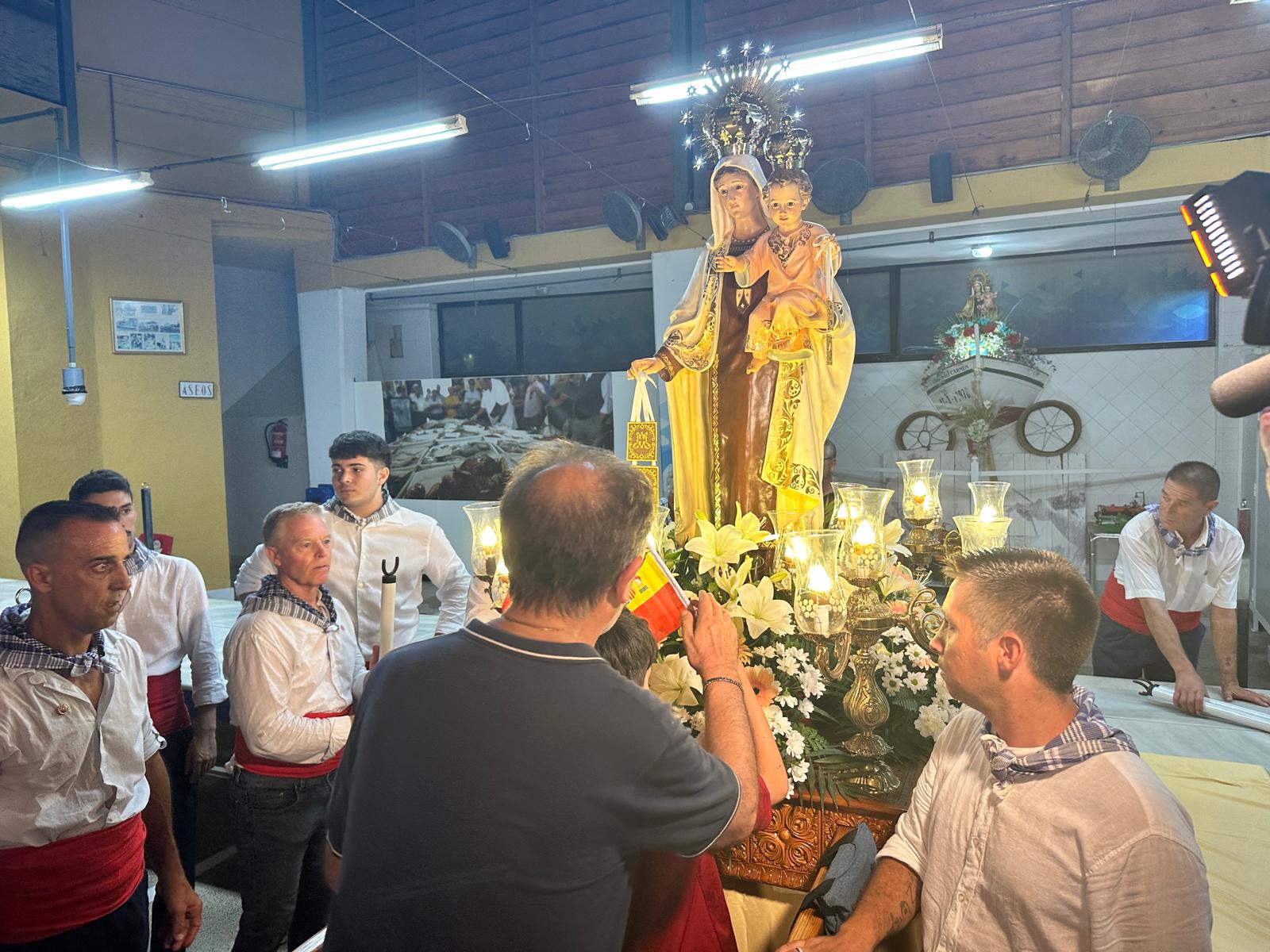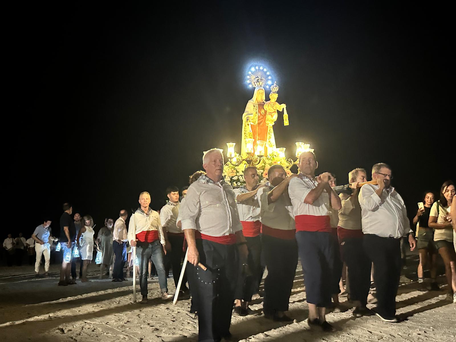 La peculiaridad de este acto radica en que el traslado se realiza atravesando la playa, sobre la arena, lo que ofrece una imagen atractiva por el paso de un trono iluminado y decenas de farolillos que portaban los participantes, entre los que se encontraban el alcalde, Juanjo Berenguer; la concejala de Fiestas y Tradiciones, Marisa Navarro, y ediles de diversos partidos políticos con representación municipal.