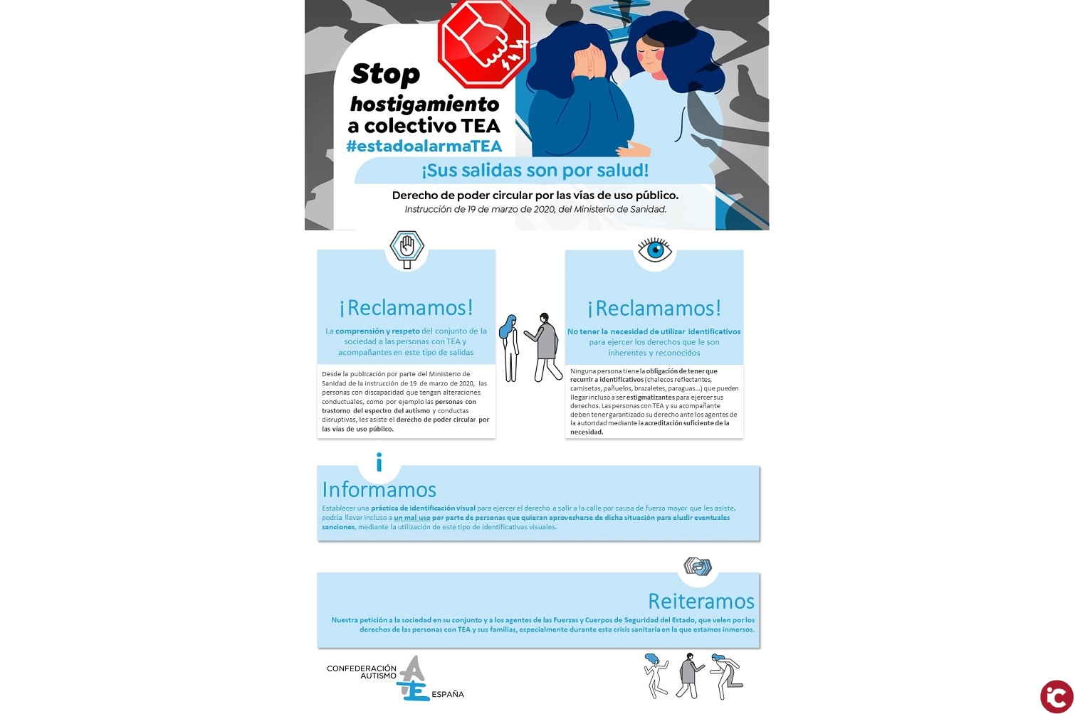 Las personas con TEA (trastorno de espectro autista) están autorizadas a salir a la calle, acompañadas, siempre que cumplan con las medidas necesarias para evitar el contagio, según norma publicada en el BOE número 76 de 20 de marzo. Esa norma habilita expresamente estos paseos para las personas con discapacidad que tengan alteraciones conductuales, que se pueden ver alteradas por la situación de confinamiento derivada de la declaración del estado de alarma
