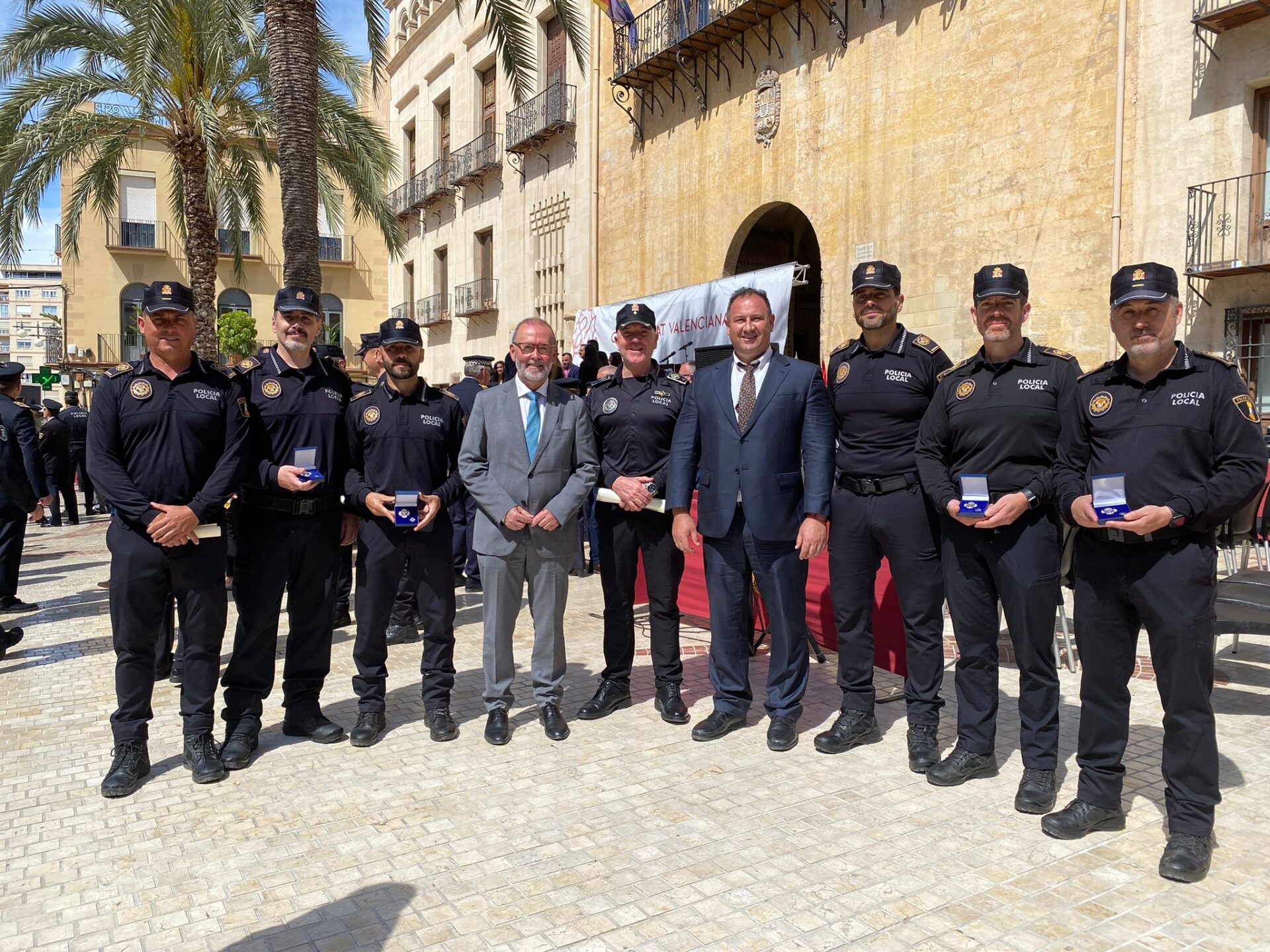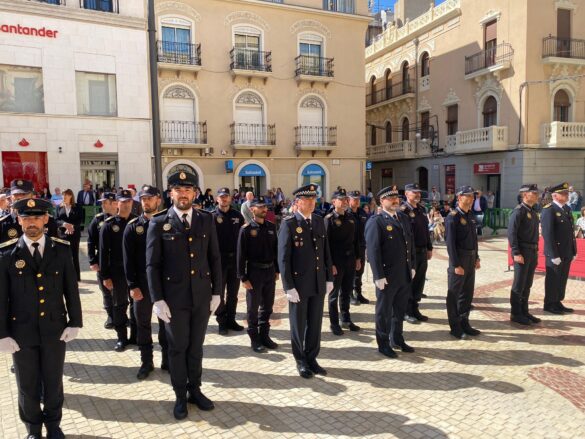 Entre ellos se encontraban siete efectivos de la Policía Local de El Campello, tres de ellos por ascender en el escalafón de mando, y cuatro a los que se homenajeó imponiéndoles la Cruz con distintivo blanco por una intervención que realizaron en enero de 2022, cuando salvaron la vida a un hombre que se encontraba en parada.