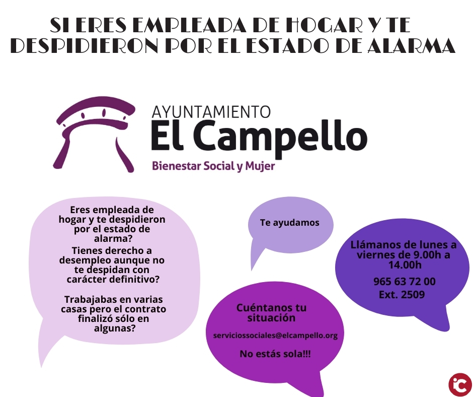 De esta manera la concejalía, consciente de la especial situación de vulnerabilidad en la que se encuentran estas mujeres, trabajadoras de unos de los sectores más afectados por las medidas decretadas por la crisis sanitaria, se dirige a las empleadas de hogar despedidas por esta circunstancia para informarlas que tienen derecho al desempleo, si estaban dadas de alta en la seguridad social antes del 14 de marzo.