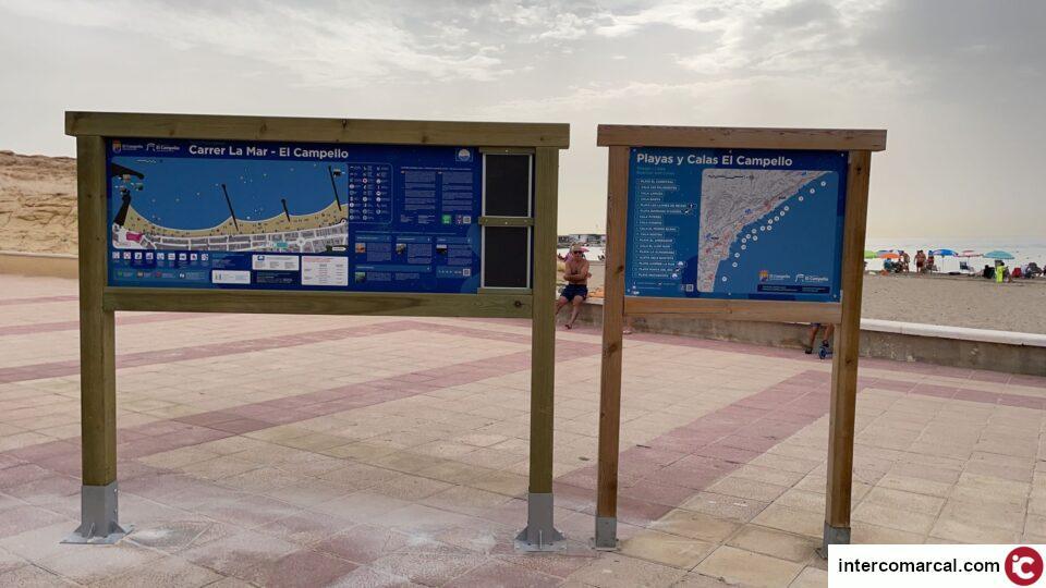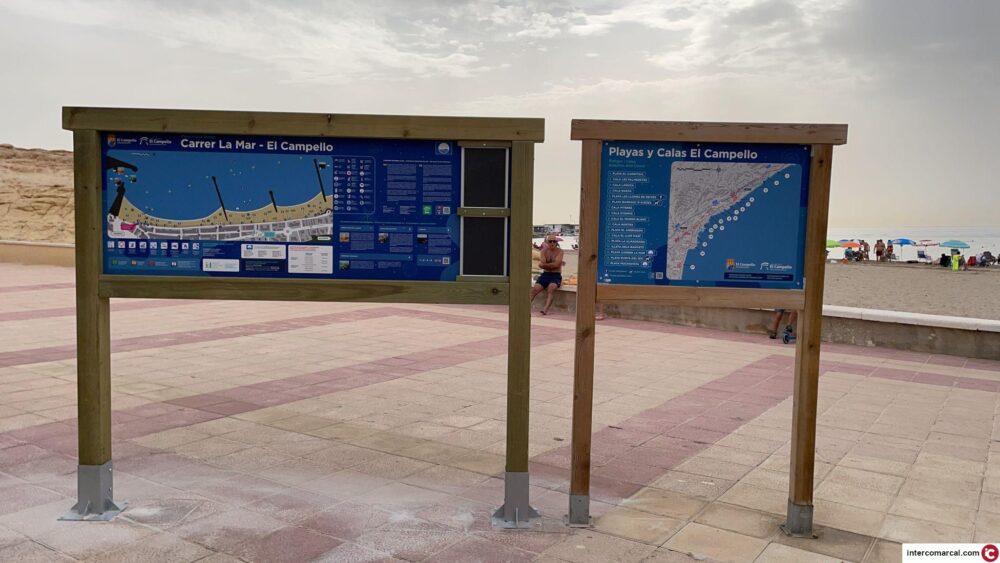 Además, leyendas explicativas con el significado de las banderas, temporada y horario del servicio de salvamento y socorrismo, prohibiciones y recomendaciones, teléfonos de interés y, como novedad, además de los puntos de interés turístico ya recogidos en los anteriores carteles relativos a la Torre de la Illeta y la Illeta Dels Banyets, Playas incorpora dos nuevos recursos de interés medioambiental: El humedal ubicado al final del trazado del río Monnegre y la ubicación de las diferentes praderas de Posidonia Oceánica.