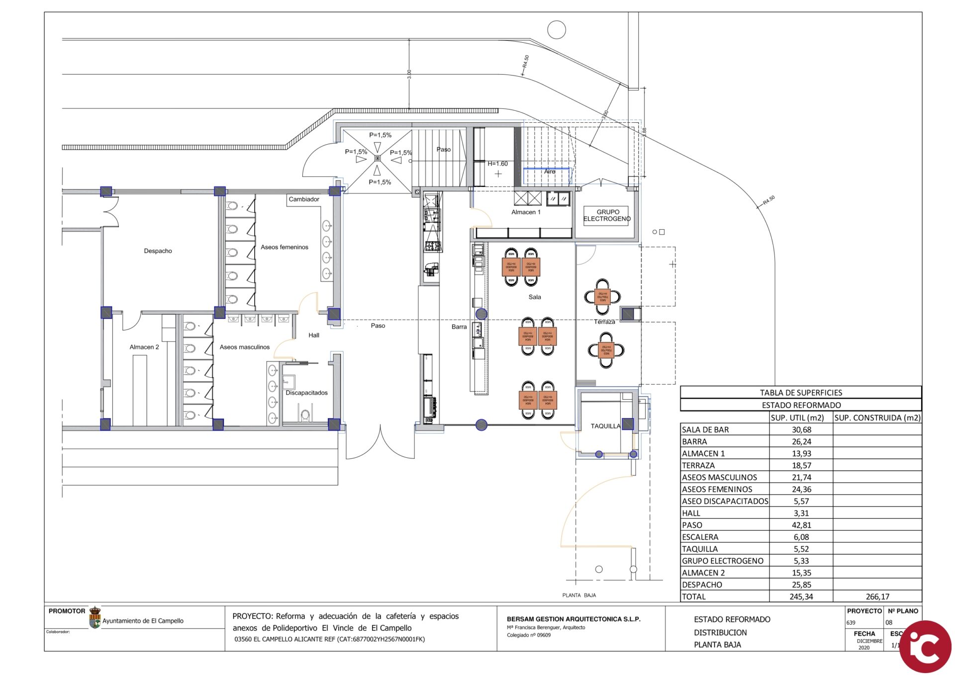 Es otro de los proyectos que Palomares ha encargado para reformar todas las instalaciones deportivas del municipio, en algunos casos muy deterioradas por el paso del tiempo y el uso intenso y prolongado. La reforma, en este caso, afectará de forma especial y sustancial a la cafetería y dependencias anexas del polideportivo.