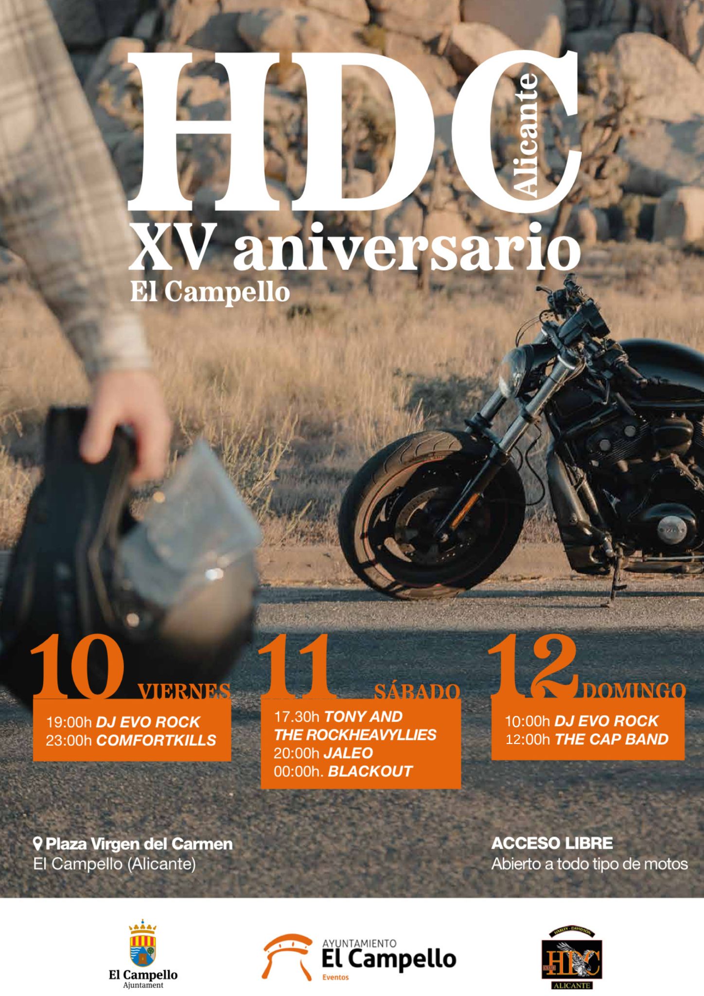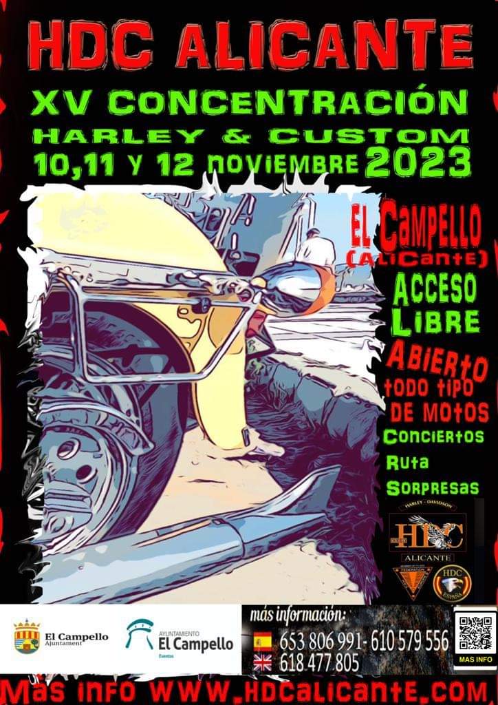 El club de propietarios de motos Harley HDC Alicante organiza de nuevo este año un intenso fin de semana de concentración de Harley Davidson y Custom en El Campello. Del 10 al 12 de noviembre se concentrarán con sus motos en la Plaza de la Virgen del Carmen, donde realizarán diversas actividades, además de conciertos abiertos al público.