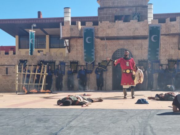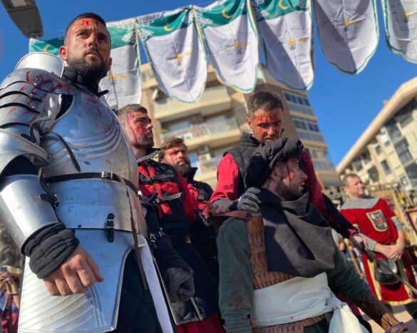 Rostros ensangrentados, lucha cuerpo a cuerpo y a cañonazos, ariete como mejor arma de asedio derrumbando las puertas del castillo, fuego por doquier y arcabucería intensa han dado forma, una vez más, a un acto que quizás sea de los más deslumbrantes de cuantos integran el intenso programa al que han dado forma la Junta Festera de Moros y Cristianos que preside Marga Sebastià y la concejalía de Fiestas y Tradiciones que dirige Cristian Palomares.