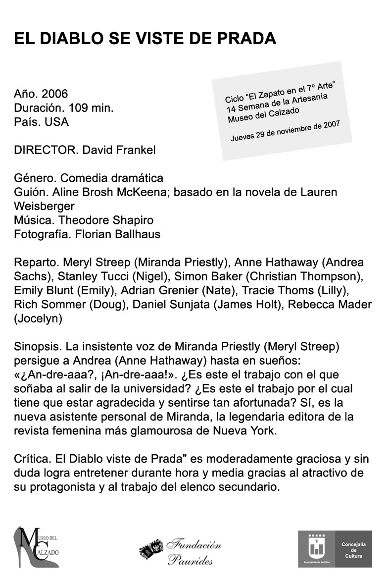 Con motivo de la 14ª Semana de la Artesanía y dentro de las actividades que la conforman, el próximo jueves, día 29 de noviembre de 2007 a las 22:00 horas, se proyectará la película El Diablo se viste de Prada de David Frankel. En la Fundación Paurides sita en la calle Cardenal Cisneros nº 1 de Elda.