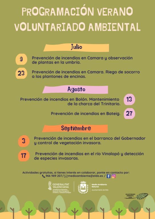 Las actividades son totalmente gratuitas y cualquier ciudadano y ciudadana puede apuntarse. Las personas interesadas pueden contactar con la Concejalía de Medio Ambiente llamando al 966 989 207, por correo electrónico (medioambiente@elda.es) o directamente a través de la página web municipal (http://www.elda.es/medio-ambiente/voluntariado-ambiental/) donde se puede descargar el formulario para remitirlo a la Concejalía.