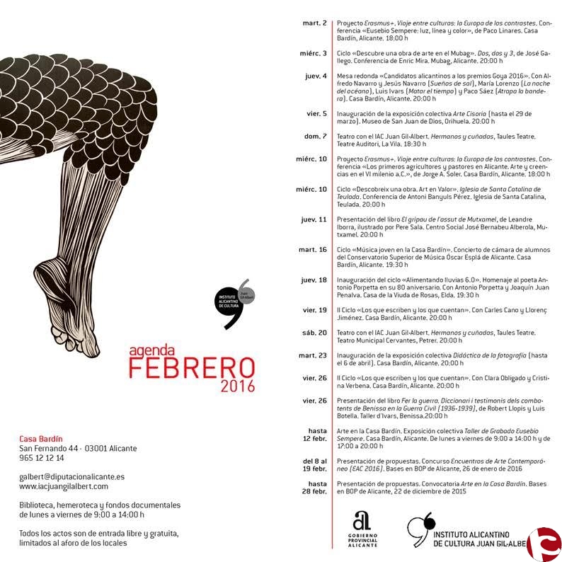 El Instituto Alicantino de Cultura «Juan Gil Albert» bajo el título «Alimentando lluvias 6.0» inicia por primera vez su ciclo anual de poesía fuera de la Casa Bardín y para ello ha elegido la ciudad de Elda. El motivo de este encuentro es rendir homenaje al poeta eldense Antonio Porpetta en su 80 aniversario, la forma, será una conversación ante el público del homenajeado con el profesor y también poeta Joaquín Juan Penalva. El lugar, día y hora, la Casa de Rosas, el jueves 18 de febrero a las 19:30. El acto va dirigido a todos aquellos que quieran compartirlo.