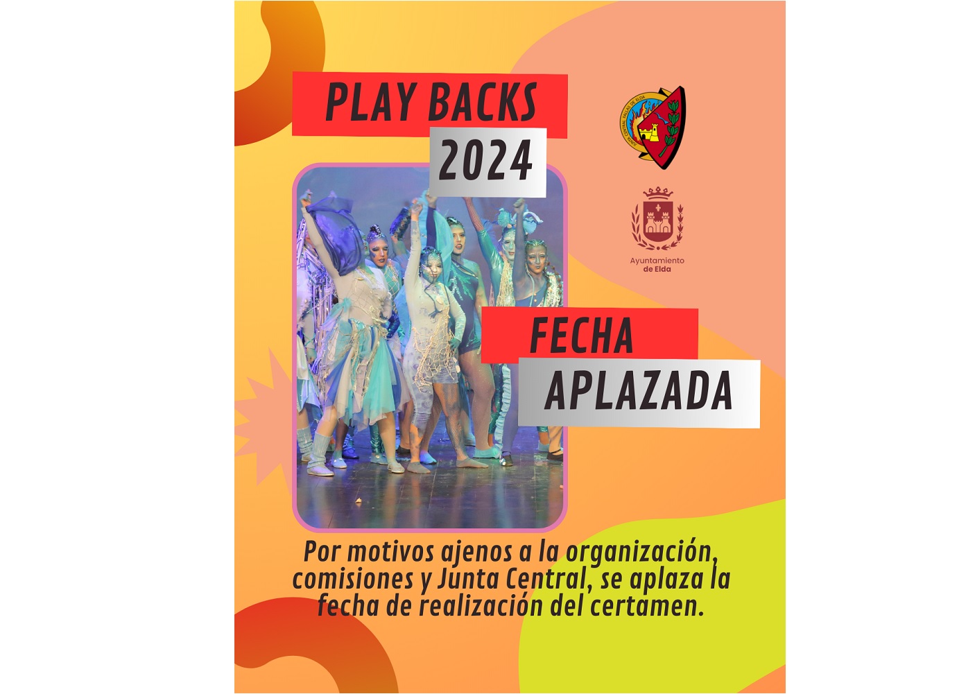 Desde Junta Central de Fallas de Elda, queremos informarles que el Festival de Playbacks 2024, originalmente programado para el próximo 24 de febrero en el Teatro Castelar de nuestra ciudad, ha sido aplazado hasta nuevo aviso.