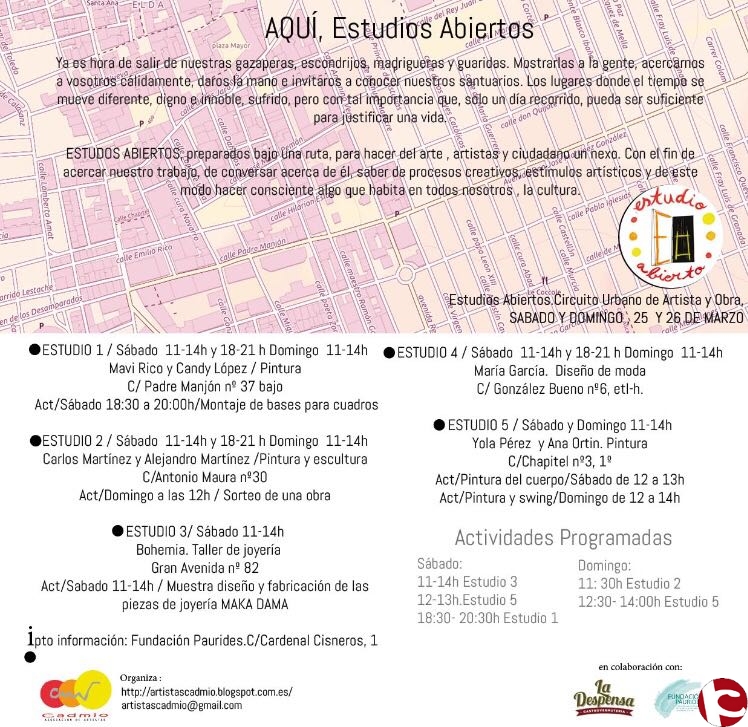 ESTUDIOS ABIERTOS, preparados bajo una ruta, para hacer el arte, artistas y ciudadano un nexo. Con el fin de acercar nuestro trabajo, de conversar acerca de él, saber de procesos creativos, estímulos artísticos y de este modo hacer consciente algo que habita en todos nosotros, la cultura.