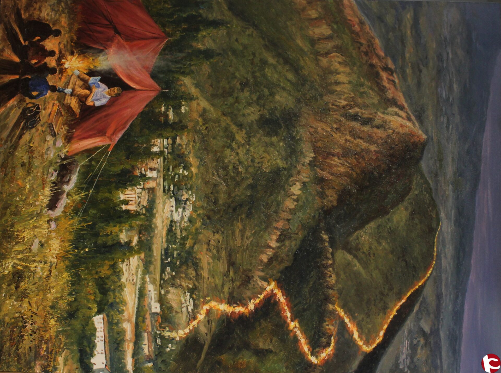 El cuadro del pintor alcoyano Mario Roig Vidal, premio de honor Cuentamontes 2015 de pintura, expresa el sentir del grupo montañero y también el de la mayoría de habitantes de este Valle al reflejar un acto tan tradicional y nuestro como lo es la Bajada de antorchas de Bolón.