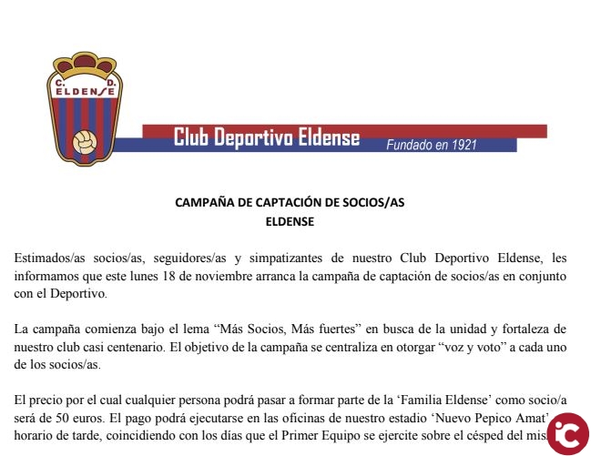 Estimados/as socios/as, seguidores/as y simpatizantes de nuestro Club Deportivo Eldense, les informamos que este lunes 18 de noviembre arranca la campaña de captación de socios/as en conjunto con el Deportivo.