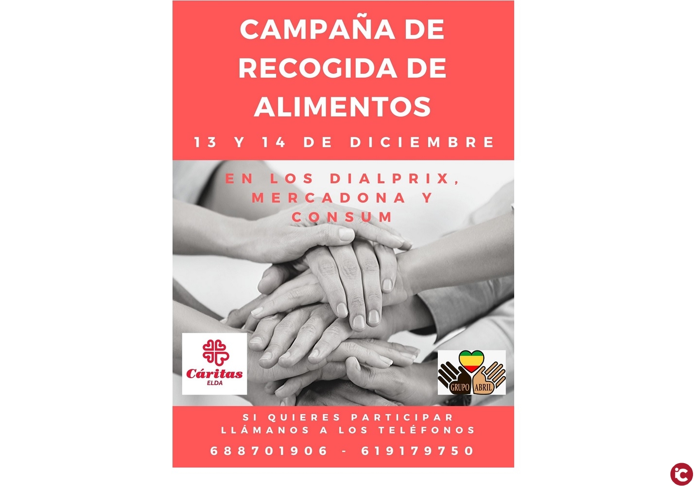 Los próximos días 13 y 14 de diciembre, durante toda la jornada, Cáritas Elda junto con el Grupo Abril, han organizado la campaña de recogida de alimentos en varios supermercados con el objetivo de recoger la mayor cantidad posible de alimentos con los que seguir acompañando a muchas familias de nuestra ciudad durante los próximos meses. Estos alimentos llenarán las despensas de ambas organizaciones, ya que la salida de alimentos está siendo muy alta.