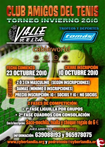 Nuevo torneo de invierno que cambia de patrocinador, ahora los patrocinadores son SEMANARIO VALLE DE ELDA, DEPORTES TOMAS Y CABLEWORLD, adjunto cartel anunciador, también se amplia el plazo de inscripciones hasta el 16 de Octubre,