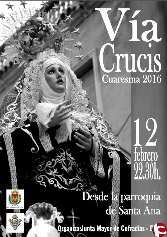 El próximo viernes día 12, primer viernes de la Cuaresma 2016, a las 22:30h. desde la parroquia de Santa Ana, como es ya tradicional desde hace más de una década, la Junta Mayor organiza la celebración del Vía Crucis, presidido por la imagen de Ntra. Sra. de la Soledad, que será portada por su cofradía a hombros de sus costaleros y que recorrerá las calles del Casco Antiguo de Elda, visitando diferentes barrios y llegando hasta las mismas faldas del Castillo para concluir de nuevo en la parroquia de Santa Ana.