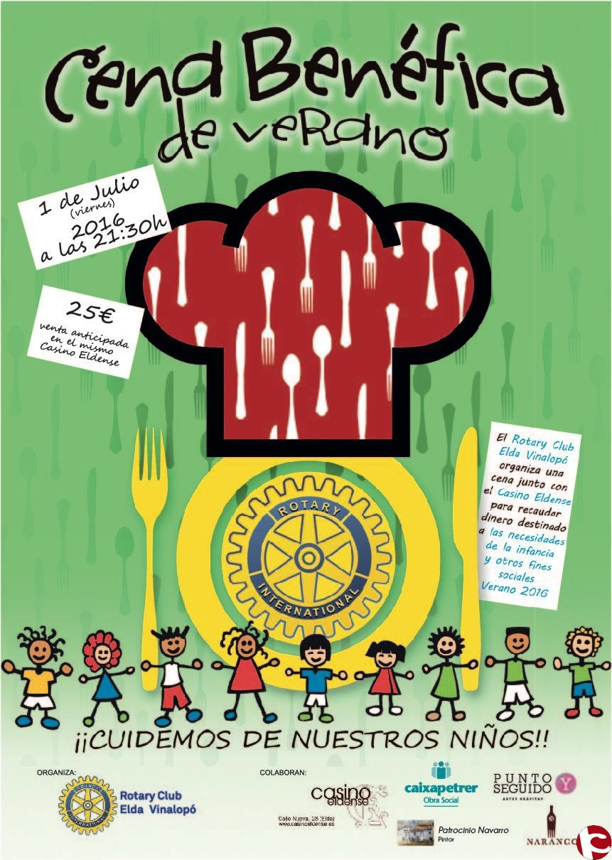 Anuncio de la gran fiesta de verano que, con carácter solidario, se va a celebrar este viernes, 1 de julio, en el Casino Eldense a partir de las 21,30 horas a beneficio de los comedores sociales que atienden en Elda a niños en riesgo de exclusión social o con familias sin recursos suficientes.