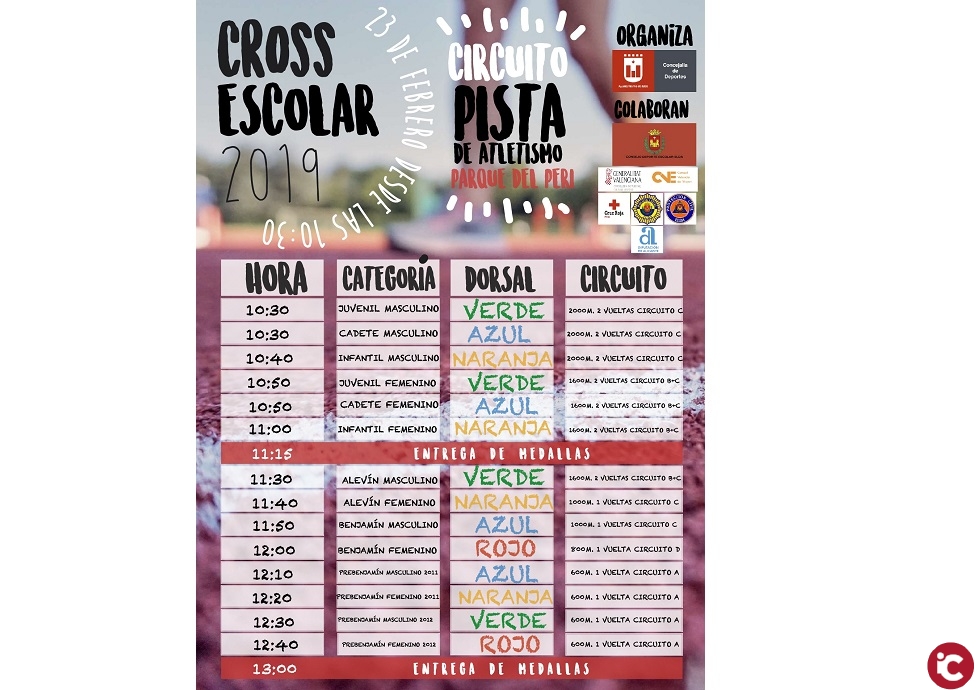 Una vez finalizado el primer reparto de premios, será el turno de los más pequeños, encuadrados en las categorías masculinas y femeninas de alevín y benjamín, mientras que los niños y niñas prebenjamines tanto de 2011 como de 2012 cerrarán la competición antes de proceder a la segunda entrega de medallas, prevista para las 13 horas: “Se trata de una prueba muy atractiva en la que, al contrario que en otras disciplinas, se va sumando más público conforme avanza la mañana, ya que los más pequeños son los últimos en competir y atraen a más familiares”, ha indicado José Joaquín Pérez, subrayando que “existen tres factores para que la prueba sea un éxito, y dos de ellos, que son la participación y el público masivo, están controlados; sólo falta que haga buen tiempo, y las previsiones así lo indican, por lo que esperamos que este Cross Escolar sea un espectáculo”.