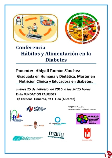 El Jueves 25 de Febrero de 2016 a las 20,15 horas habrá una CHARLA SOBRE LOS HÁBITOS Y ALIMENTACIÓN PARA LA DIABETES organizada por la Asociación de Diabéticos de Elda y comarca.