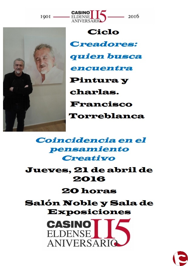 El próximo jueves 21 de abril a las 20:00 tendrá lugar el Ciclo «Creadores: quien busca encuentra» Pintura y charlas de la mano de Francisco Torreblanca y que se celebrará en el Salón Noble y Sala de Exposiciones del Casino Eldense