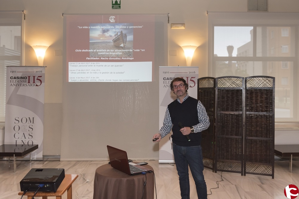 El primer Ciclo Salud Emocional del Casino Eldense ofreció en la segunda entrega un coloquio entre Ignacio González Jiménez, psicólogo, y los asistentes sobre Otras pérdidas en la vida y la gestión de la soledad. Fueron abordadas esas otras pérdidas (en la cita anterior ya se afrontó la muerte de un ser querido), del trabajo, de la pareja por separación o de los hijos por cuestiones profesionales entre otros motivos expuestos por el facilitador, que ha trabajado como psiconcólogo en áreas de salud como oncología, cuidados paliativos o duelo.