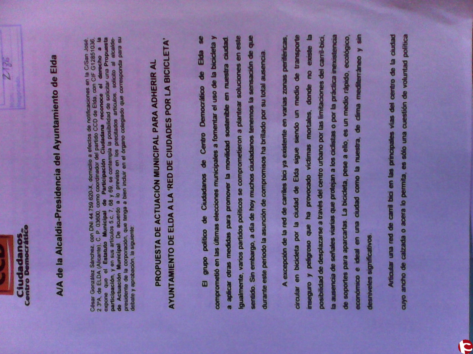 César González Sánchez, con DNI 44.759.620-X, domicilio a efectos de notificaciones en la C/San José, 2 3ºA, de ELDA (Alicante), C. P. 03600, como coordinador del partido CCD de Elda, con CIF G12851036, expone que el Estatuto Municipal de Participación Ciudadana reconoce el derecho a la participación, y en sus artículos 5.c, 7, 68 y 69, se contempla la posibilidad de solicitar una Propuesta de Actuación Municipal. De acuerdo a lo previsto en los precitados artículos, solicito al alcalde-presidente de la corporación, que tenga a bien incluir en el órgano colegiado que corresponda para su debate y aprobación, la siguiente: