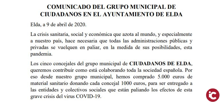 Los cinco concejales del grupo municipal de CIUDADANOS DE ELDA, queremos contribuir como está colaborando toda la sociedad española. Por eso desde nuestro grupo municipal, hemos comprado 5.000 euros de material sanitario donando cada concejal 1000 euros, para ser entregado a