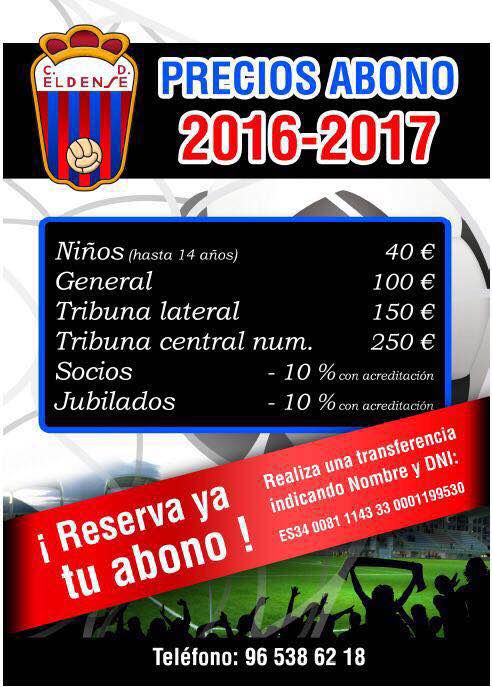 El Club Deportivo Eldense quiere informar de los precios de los abonos para la temporada 2016/2017. Las categorías serán las mismas que las de otros años, salvo una novedad, el abono de tribuna central numerada. Esta novedad se debe a la gran demanda de numerosos abonados habituales en el estadio Nuevo Pepico Amat, que nos pedían tener su asiento fijo todos los partidos y no tener que ir una hora antes de cada encuentro para coger su localidad preferida. Las demás categorías seguirán siendo niños, general, tribuna lateral y como decimos la tribuna central numerada. Con los siguientes precios: