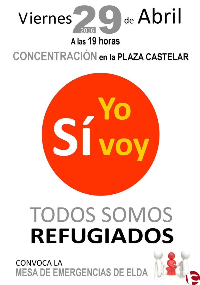 La Mesa de Emergencias de Elda convocó una concentración a favor de los refugiados sirios. Durante esta actividad se reivindicó la dignidad de las personas que viven en campamentos de refugiados, para que la Unión Europea les ofrezca una solución rápida y digna. En la concentración, llamada “Yo sí voy. Todos somos refugiados”, se recogieron alimentos, material de acampada, mochilas portabebés, carros, juguetes, zapatos y útiles de aseo.