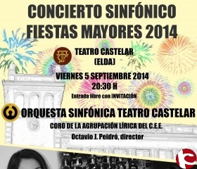 CONCIERTO SINFÓNICO FIESTAS MAYORES – 2014. A cargo de la Orquesta Sinfónica Teatro Castelar, acompañada del Coro de la Agrupación Lírica del C.E.E. y los solistas Alfredo Ferre Martínez (Violonchelo) y Cristina Sánchez Montes (Soprano). Director: Octavio J. Peidró / Organiza: Excmo. Ayuntamiento de Elda / Patrocina: Excma. Diputación de Alicante.