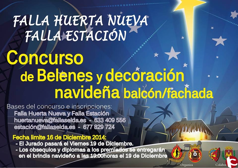 Podrán participar en el concurso todos los domicilios particulares que estén legalmente constituidos en el barrio de Huerta Nueva y Estación. Se establecen dos categorías: Belenes y Decoración navideña de balcón. Las inscripciones se realizarán en los locales de ambas entidades desde el día de hoy hasta el día 16 de Diciembre, o bien en los correos electrónicos: huertanueva@fallaselda – estación@fallaselda o en los números de teléfono: 633 409 556 y 677 829 724