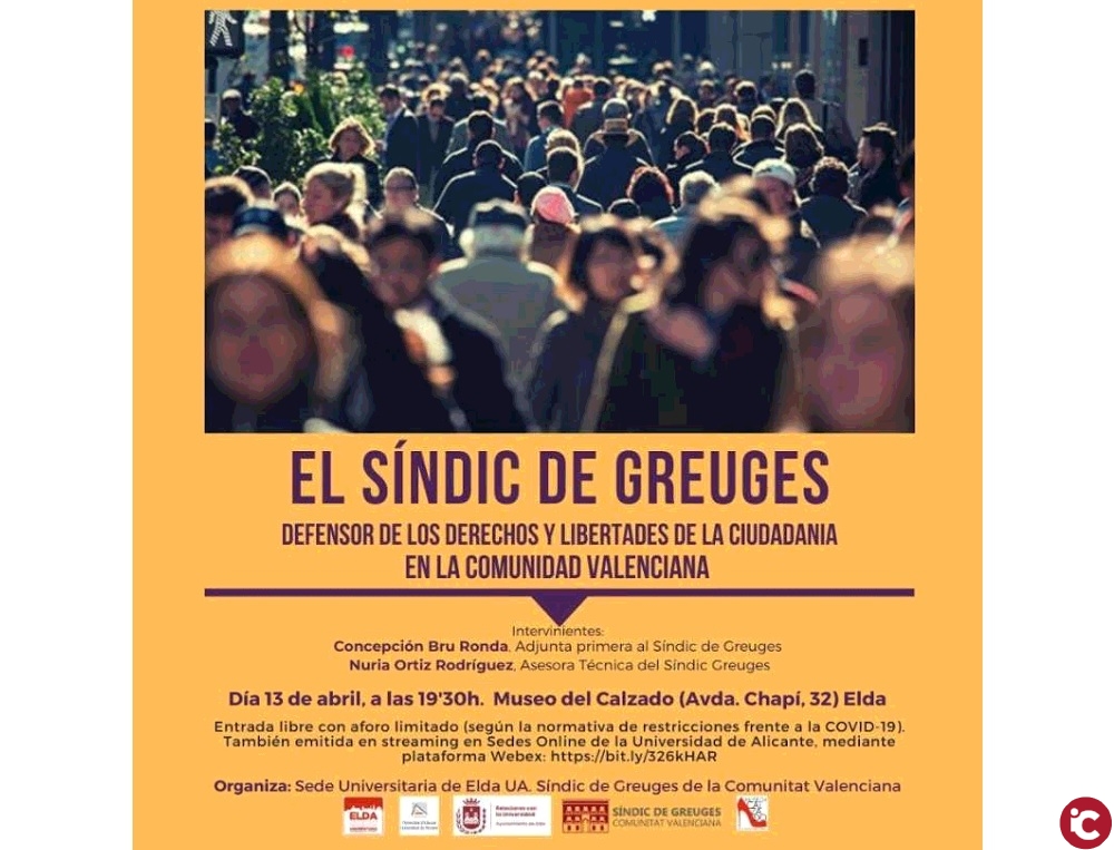 Organizan: Sede Universitaria de Elda de la Universidad de Alicante, el Ayuntamiento de Elda y el Síndic de Greuges de la Comunitat Valenciana. Tipo de actividad: dual, con presencialidad de asistentes en sala abierta con aforo limitado a normas Covid. Será también emitida en streaming en Red de Sedes Universitarias UA, mediante plataforma webex, enlace: https://bit.ly/326kHAR