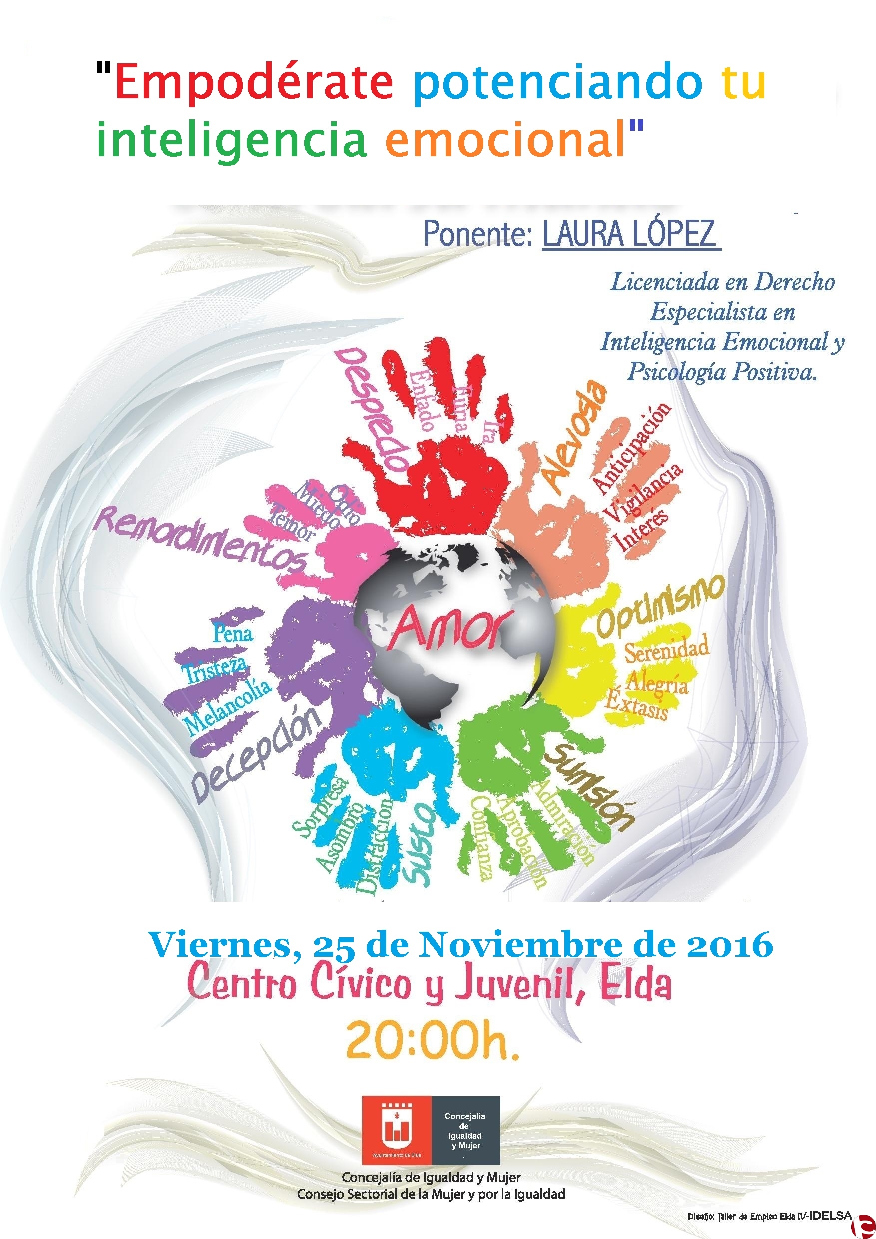 La Concejalía de Igualdad y Mujer del Ayuntamiento de Elda y el Consejo Sectorial de la Mujer y por la Igualdad organizan la conferencia Empodérate potenciando tu inteligencia emocional, que se enmarca dentro de las actividades conmemorativas de la celebración del Día Internacional de la Eliminación de la Violencia contra las Mujeres.