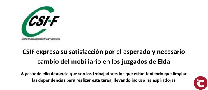 (2019-4-2) El sindicato CSIF quiere expresar su satisfacción por el hecho de que el mobiliario de los juzgados de Elda que se acumulaba desde hace meses en los de Novelda, y que va destinado a renovar el que data de 1981, haya comenzado a instalarse.