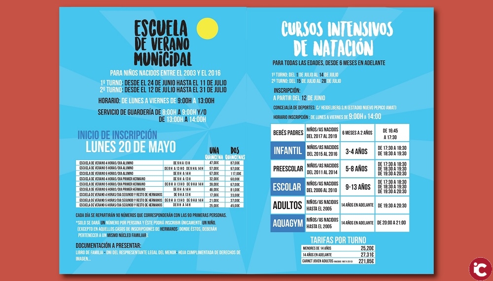 El plazo de inscripción para la escuela de verano comienza el 20 de mayo y se ofertarán alrededor de 600 plazas, por otra parte, el plazo de inscripción para los cursos intensivos de natación se abre el 12 de junio