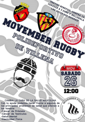 ¡NOS SUMAMOS A MOVEMBER! Si quieres contribuir a luchar contra los problemas de salud masculina puedes hacerlo con nosotros de dos maneras: 1- No perderte el partido organizado por CAUDETE RUGBY UNIÓN que tendrá lugar el Sábado 26 de Noviembre a las 12:00 en el campo de rugby de Villena, con la colaboración de Villena Club de Rugby y Monastil Rugby Elda, en el que haremos una recaudación voluntaria para ingresarlo en la Fundación Movember. Enlace del evento: https://es.movember.com/events/view/id/em32?act=updated 2- Haciendo un ingreso con tu donativo a través de nuestra página de recaudación: http://moteam.co/caudete-rugby-union