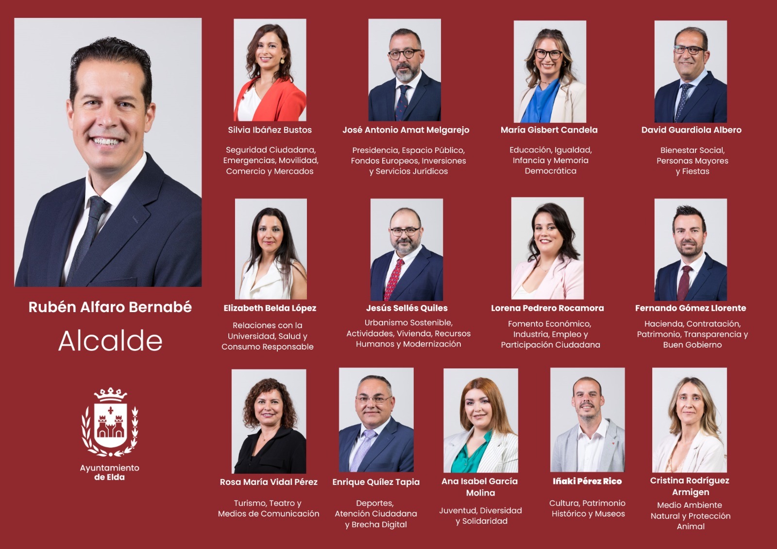 La distribución de competencias queda de la siguiente manera: Silvia Ibáñez (Seguridad Ciudadana, Emergencias, Movilidad, Comercio y Mercados); José Antonio Amat (Presidencia, Espacio Público, Fondos Europeos, Inversiones y Servicios Jurídicos); María Gisbert (Educación, Igualdad, Infancia y Memoria Democrática); David Guardiola (Bienestar Social, Personas Mayores y Fiestas); Elizabeth Belda (Relaciones con la Universidad, Salud y Consumo Responsable); Jesús Sellés (Urbanismo Sostenible, Actividades, Vivienda, Recursos Humanos y Modernización); Lorena Pedrero (Fomento Económico, Industria, Empleo y Participación Ciudadana); Fernando Gómez (Hacienda, Contratación, Patrimonio, Transparencia y Buen Gobierno); Rosa Vidal (Turismo, Teatro y Medios de Comunicación); Enrique Quílez (Deportes, Atención Ciudadana y Brecha Digital); Anabel García (Juventud, Diversidad y Solidaridad); Iñaki Pérez (Cultura, Patrimonio Histórico y Museos) y Cristina Rodríguez (Medio Ambiente Natural y Protección Animal).