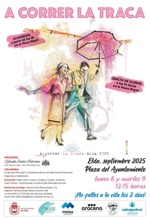 La Cofradía de los Santos Patronos de Elda ha presentado esta mañana la camiseta identificativa para Correr la Traca 2025, que incorpora un diseño realizado por el artista eldense Alejandro Torres. En la presentación de la ilustración ha estado presente el concejal de Fiestas, David Guardiola, acompañado de Ramón González, presidente de la Cofradía de los Santos Patronos, de Marina Pérez, miembro de la comisión de Globos y Traca de la Cofradía, y del propio artista.