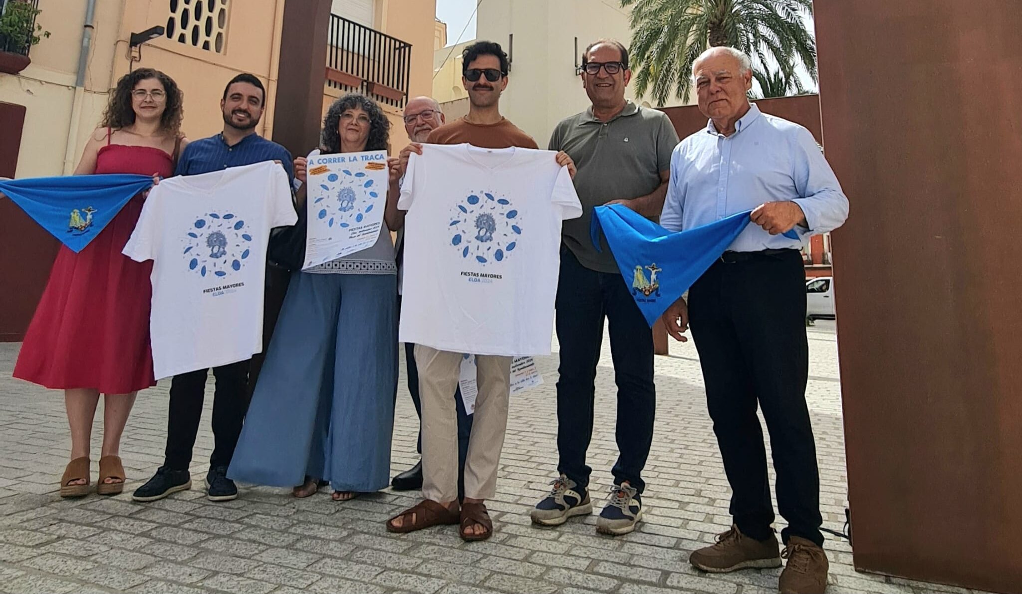 La Cofradía de los Santos Patronos de Elda ha presentado esta mañana la camiseta identificativa para Correr la Traca 2024, que incorpora un diseño realizado por el artista eldense Héctor Sanz. En la presentación de la ilustración ha estado presente el concejal de Fiestas, David Guardiola, acompañado de Ramón González, presidente de la Cofradía de los Santos Patronos, de Marina Pérez, miembro de la comisión de Globos y Traca de la Cofradía, y del propio Héctor Sanz.