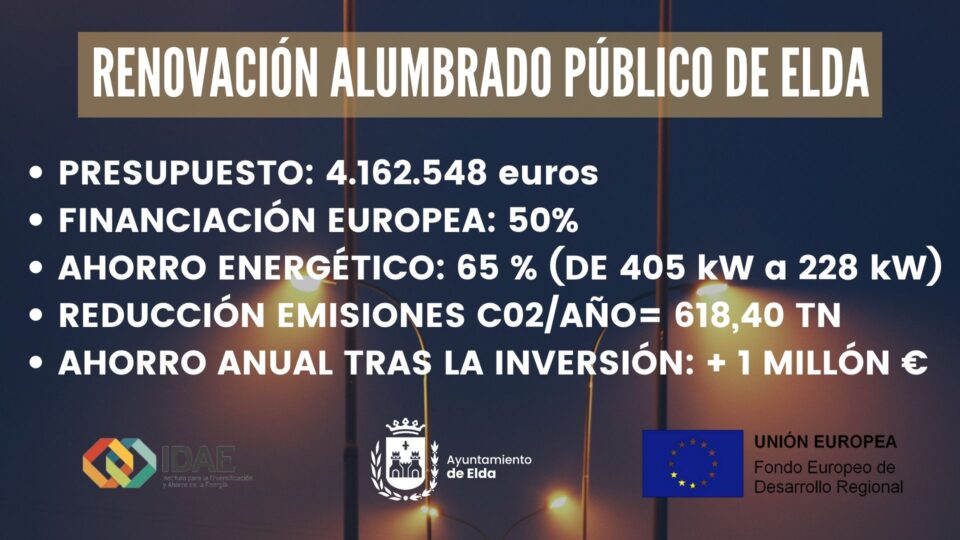 El concejal de Servicios Públicos Sostenibles, Inversiones y Fondos Europeos, José Antonio Amat, ha afirmado que esta contratación “forma parte de la apuesta del gobierno local por avanzar en la transformación de Elda en una ciudad sostenible, limpia y por una energía limpia, asequible y no contaminante”. El edil ha recordado que “esta actuación, que cuenta con financiación europea, permitirá renovar el alumbrado público de nuestra ciudad, lo que supondrá una reducción muy importante del consumo energético, con el consiguiente ahorro para los vecinos y vecinas de Elda”.