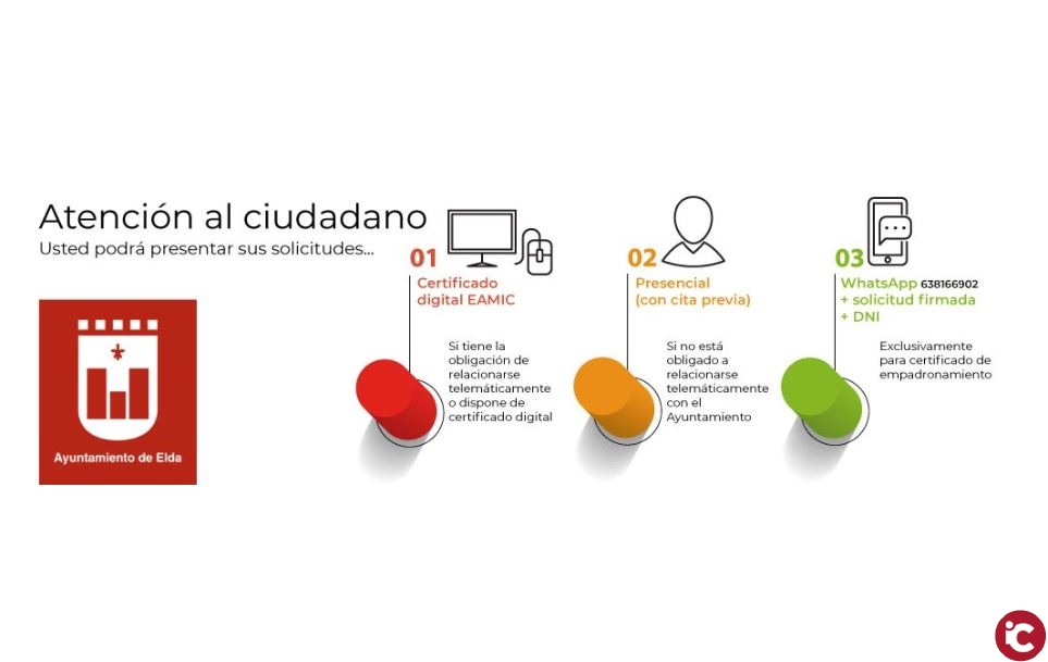 La atención presencial se realiza exclusivamente con cita previa, que puede obtenerse desde el día 22 a través de la página web del Ayuntamiento de Elda (www.elda.es).