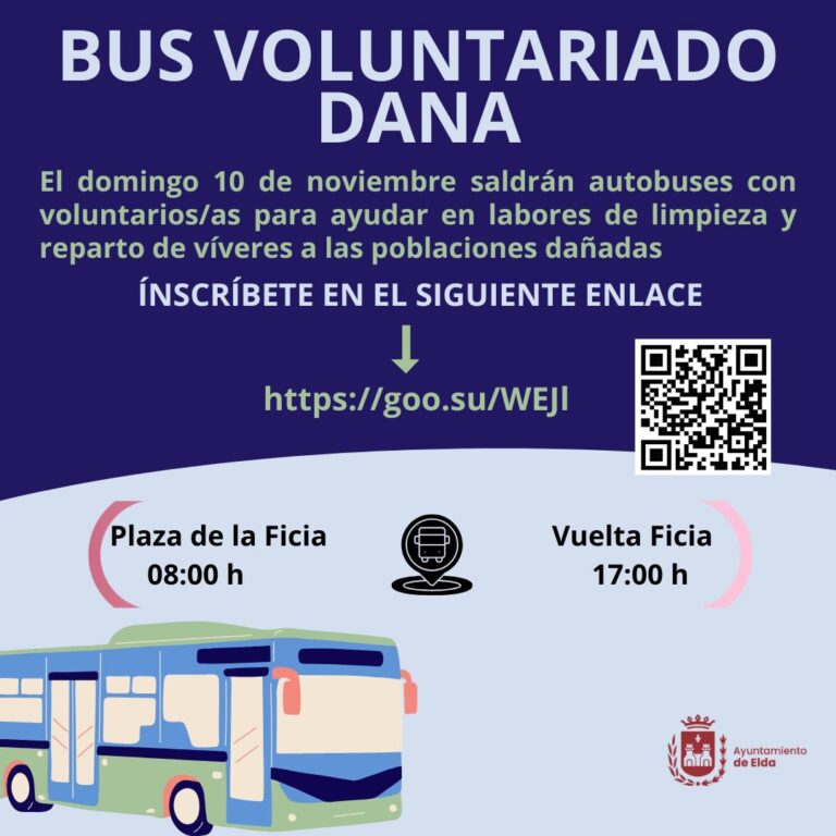 El Ayuntamiento de Elda, a través de las concejalías de Solidaridad y de Juventud, fletará el próximo domingo tres autobuses con más de 150 voluntarios y voluntarias para ayudar a las personas afectadas por la DANA. En esta ocasión, la expedición eldense partirá a las 8.00 horas con destino a la localidad valenciana de Sedaví, donde permanecerá hasta las 17.00 horas realizando labores de limpieza.