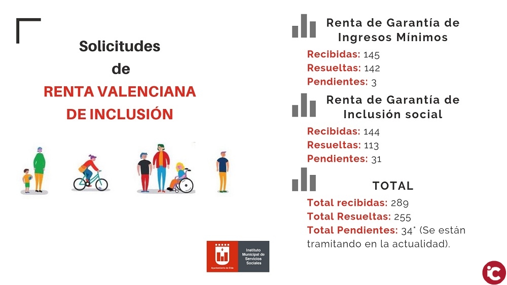 El Ayuntamiento de Elda ha tramitado 289 solicitudes de la Renta Valenciana de Inclusión hasta la fecha, de las que 145 corresponden a la Renta de Garantía de Ingresos Mínimos y 144 a la Renta de Garantía de Inclusión Social. El alcalde de Elda, Rubén Alfaro, y la concejala de Servicios Sociales, Alba García, han dado a conocer hoy estos datos.