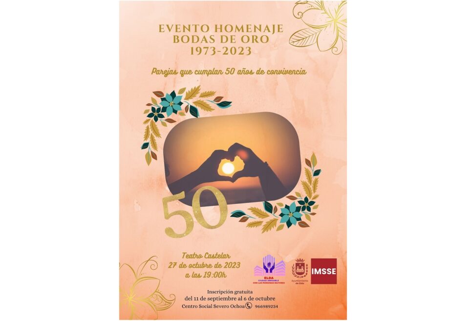 12 de septiembre de 2023.- El Teatro Castelar acogerá el próximo 27 de octubre una nueva edición del evento ‘Bodas de Oro’, una celebración que dará comienzo a las 19.00 horas y en la que una vez más se rendirá homenaje a aquellas parejas empadronadas en Elda que durante el presente año celebran sus 50 años de matrimonio.