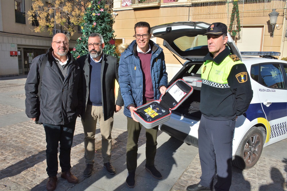 El alcalde de Elda, Rubén Alfaro, junto con el concejal de Seguridad Ciudadana, Jose Antonio Amat, el concejal Paco García y el comisario principal, Francisco Cazorla, ha anunciado que, a partir de ahora, la Policía Local de Elda dispondrá de tres desfibriladores portátiles.