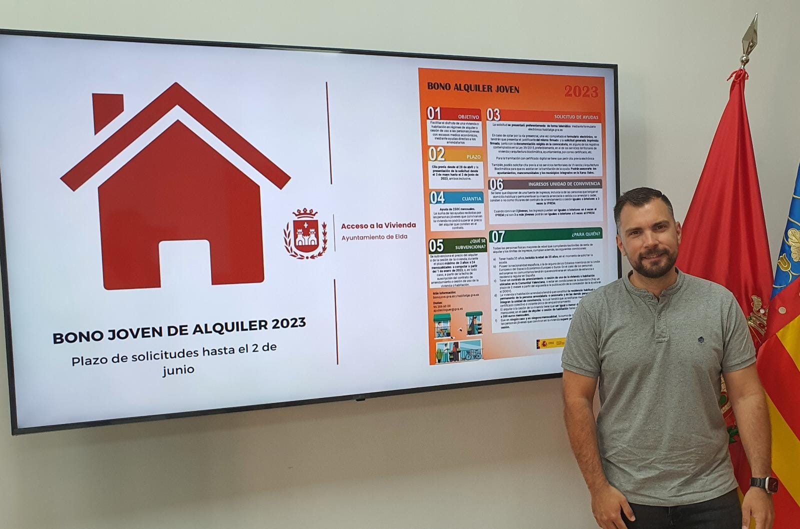 8 de mayo de 2023.- El Ayuntamiento de Elda , a través de la Concejalía de Acceso a la Vivienda, ha comenzado la tramitación del Bono Joven de Alquiler, destinado a menores de 35 años. El plazo para presentar las solicitudes permanecerá abierto hasta el 2 de junio y se pueden presentar las solicitudes tanto para alquiler de viviendas como de habitaciones.